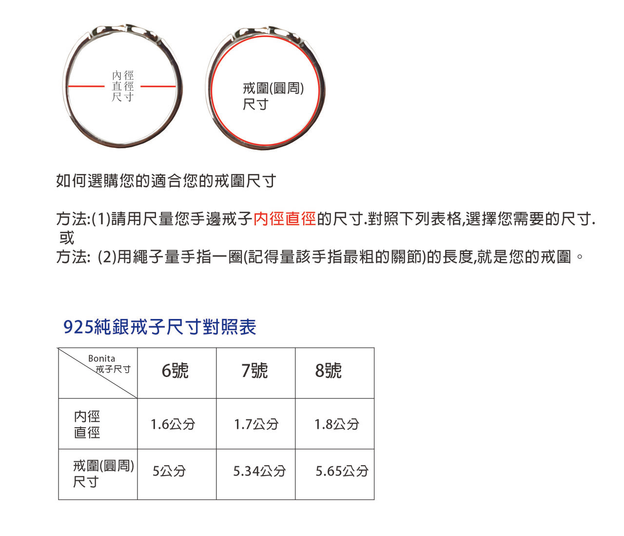 尺寸:7號 - (內直徑)1.7公分/(圓週)5.4公分 尺寸:8號 - (內直徑)1.8公分/(圓週)5.7公分 材質:925純銀 備註:尺寸測量有差0.2公分為合理情況 生產國:泰國製
