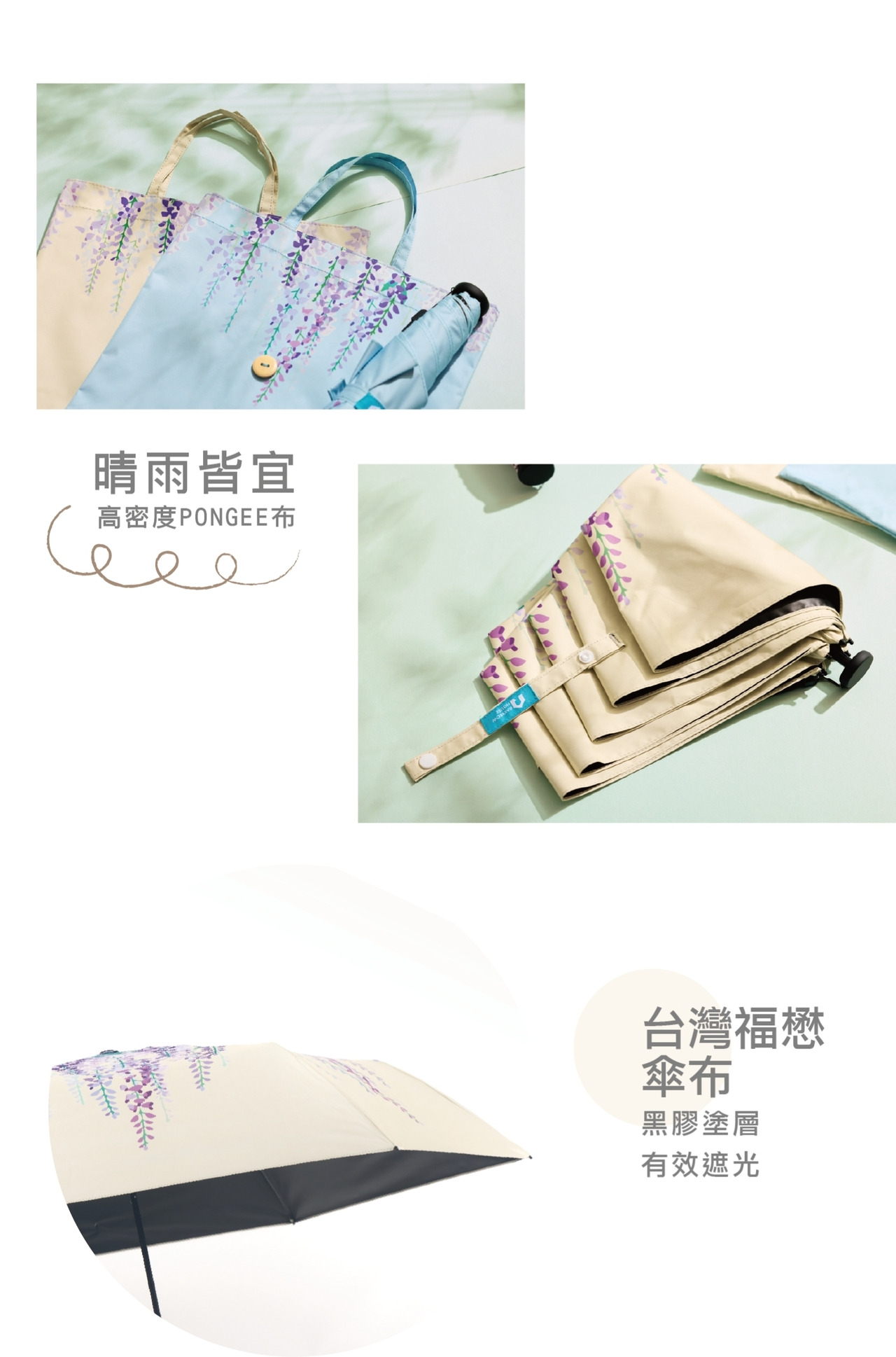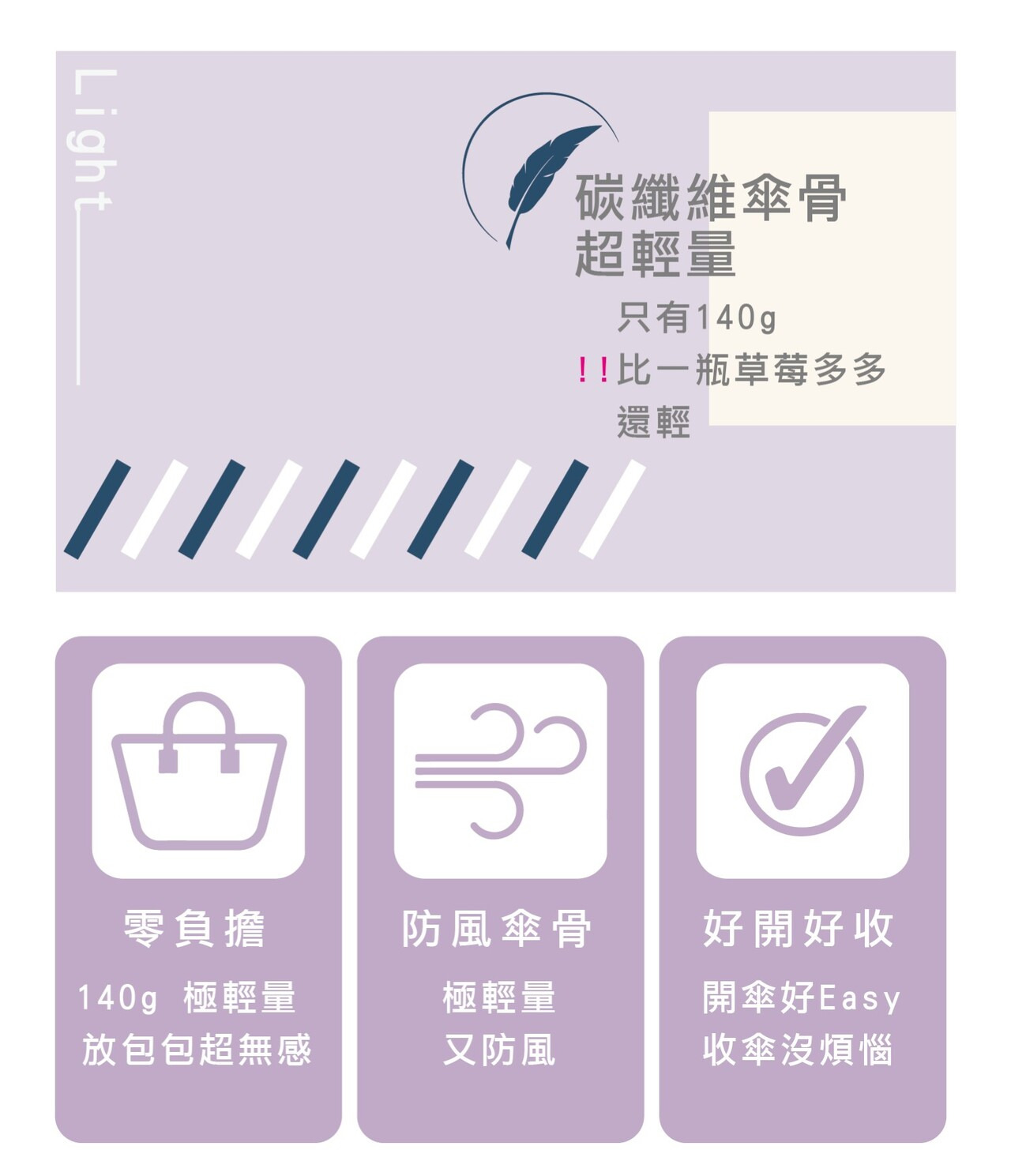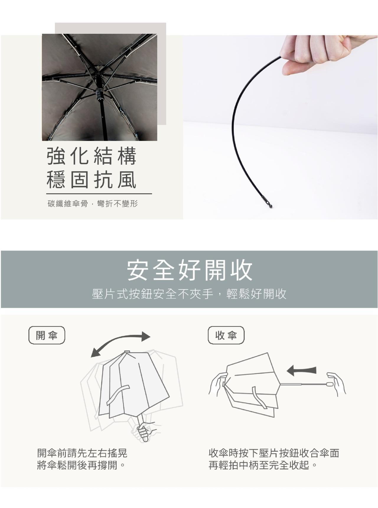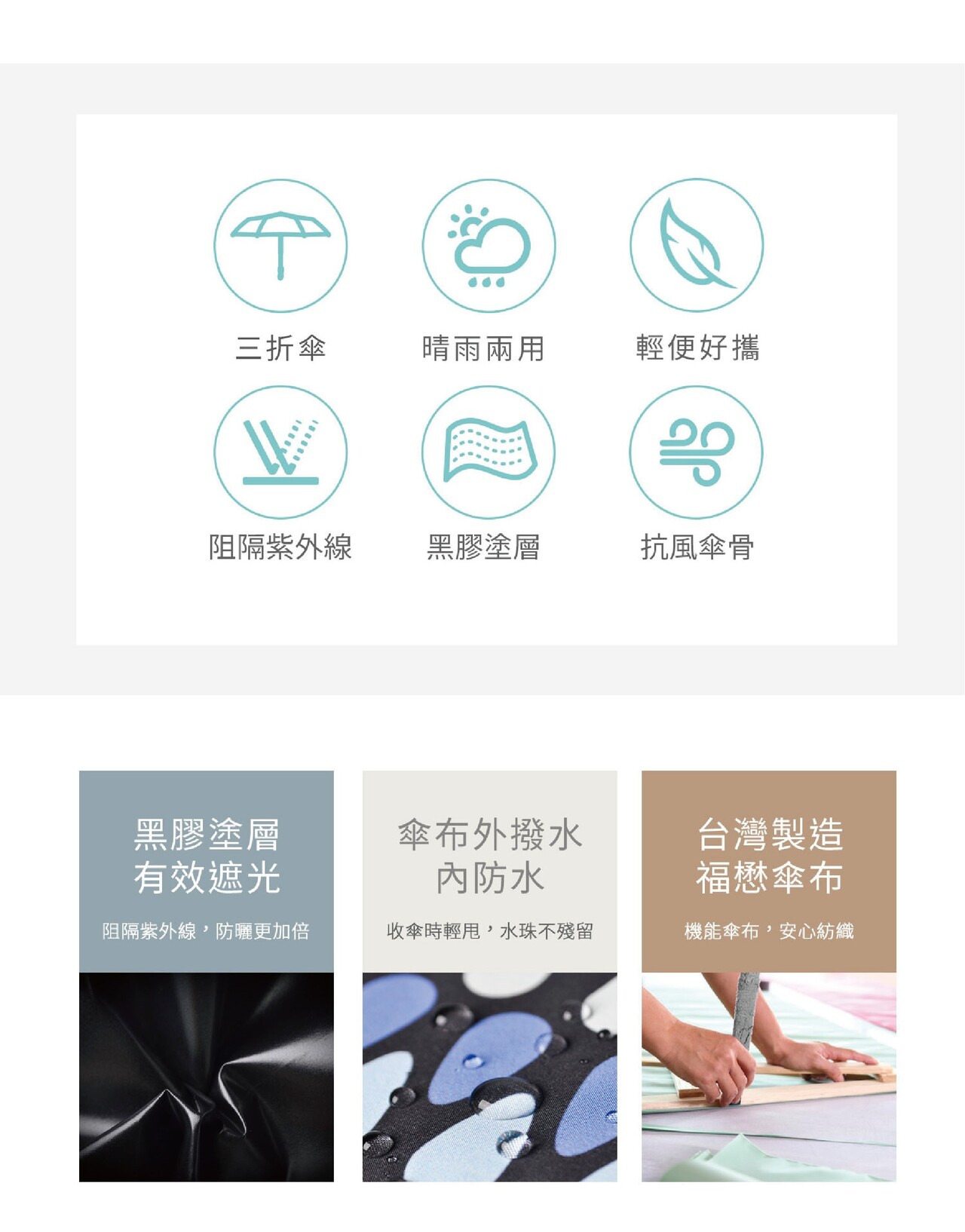 ●UPF50+ A級遮光布。防曬黑膠 ● 玻璃纖維傘骨,柔韌堅固。 ●外層防潑水加工,水滴不留痕 。●140g 極輕量,攜帶輕輕鬆鬆