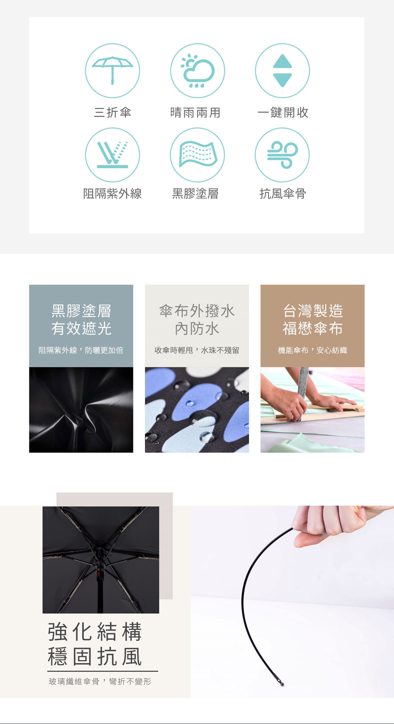 ● 玻璃纖維傘骨,柔韌堅固。